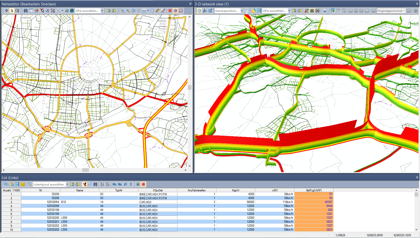 Die Vielfalt der Darstellungsmöglichkeiten in Visum wird Ihnen in den nachfolgenden Kapiteln vorgestellt. Sie beziehen sich in der Regel auf spezifische Möglichkeiten bestimmter Ausgabe- oder Darstellungsformate, die durch Layout- bzw. Grafikeinstellungen definiert werden. Oft ermöglicht jedoch erst die Kombination verschiedener Fenster und Editoren ein umfassendes Bild über Modellinhalte und -ergebnisse. Je nach Bearbeitungsstand können unterschiedliche Aspekte der Daten von Interesse sein. Beispielsweise liegt im Modellaufbau der Fokus auf Eingabedaten und deren Darstellung. Bei der Kalibrierung bzw. Validierung des Modells werden Auswertungen oder Vergleichsdaten benötigt, die auf unterschiedlichste Weise dargestellt werden können.