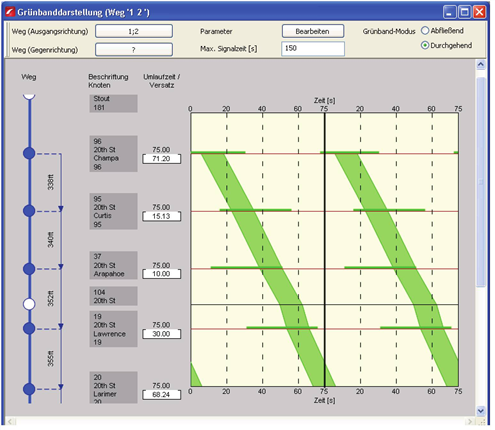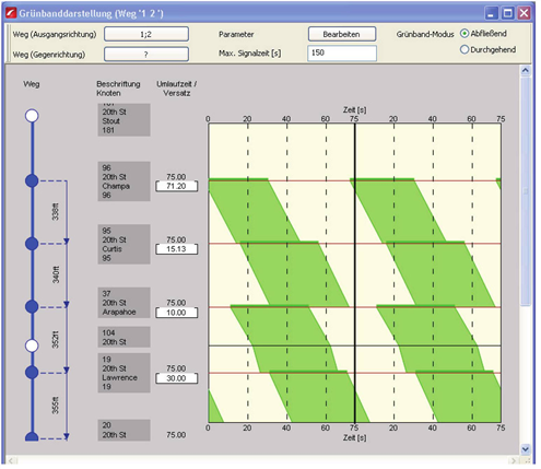 Die Versatzzeiten der Lichtsignalanlagen können direkt im Diagramm bearbeitet werden, um die Grünbänder aufeinander abzustimmen.
