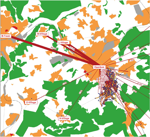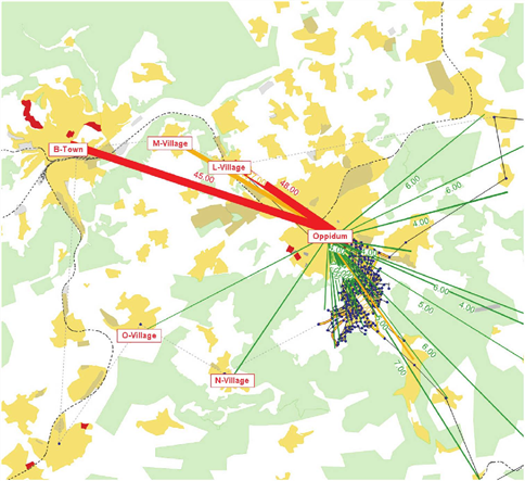 Die Darstellung von Matrixspinnen bietet sich insbesondere für die Veranschaulichung von Nachfragematrizen und Kenngrößenmatrizen im Netzeditor an. So kann man beispielsweise einen Überblick darüber gewinnen, auf welchen Relationen (Von-Bezirk zu Nach-Bezirk) eine besonders hohe Nachfrage herrscht. Das in Abbildung 261 gezeigte Beispiel zeigt die Verkehrsnachfrage zwischen dem Bezirk Oppidum und allen anderen Bezirken. Man sieht, dass insbesondere zwischen den Bezirken Oppidum und B-Town eine hohe Nachfrage vorliegt.