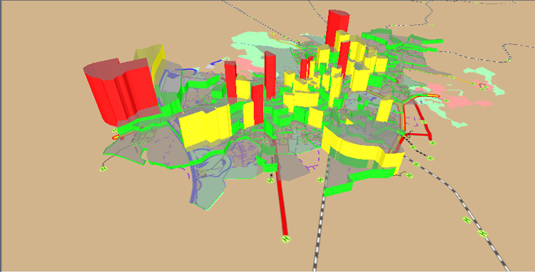 In 3D-Prismendarstellungen flächiger Objekte (Bezirke, Gebiete, POIs,…) werden die Polygonumrisse in die Höhe extrudiert, sodass prismenförmige Körper entstehen. Die Höhe der Prismen wird dabei über beliebige numerische Attributwerte skaliert. Für die Darstellung können die üblichen Grafikparameter verwendet werden.
