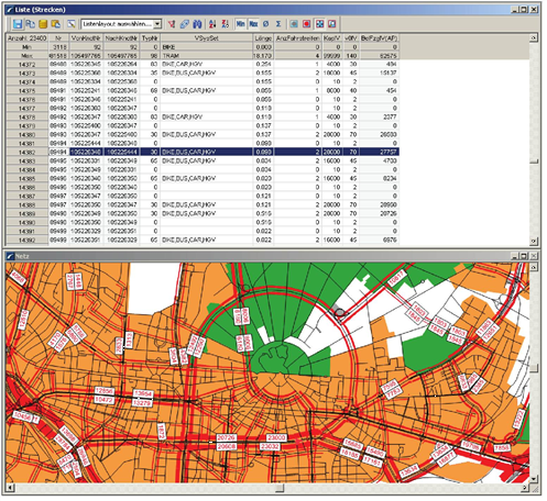 Visum bietet vielfältige Möglichkeiten die Daten Ihres Verkehrsmodells in grafischer oder tabellarischer Form darzustellen. So können Sie die Modelldaten aus verschiedenen Sichten analysieren. Zum Beispiel ist es möglich, die in einer Umlegung ermittelten Streckenbelastungen sowohl tabellarisch in einer Liste, als auch grafisch als Streckenbalken im Netzeditor auszugeben, wie Abbildung 246 zeigt. Im Folgenden werden häufig genutzte Darstellungsarten an Beispielen vorgestellt. In erster Linie sollen diese eine Vorstellung über die Vielfalt der grafischen Darstellungsmöglichkeiten in Visum vermitteln. Alle Einstellungsmöglichkeiten für Grafikparameter und Listen finden Sie in der detaillierten Beschreibung (Anwendung: Daten tabellarisch und grafisch darstellen).