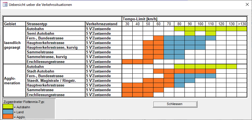 Gibt es für die angegebene Kombination von städtisch/ländlich und HBEFA-Streckenklasse keine Verkehrssituation, wird die Default-Verkehrssituation ländlich geprägt/Motorway-National/80km/h verwendet.