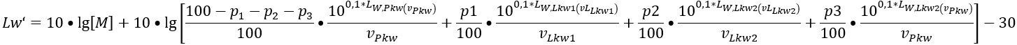 • Die Berechnung des längenbezogenen Schallleistungspegels einer Quelllinie nach Gleichung (4), RLS-19 wurde angepasst, um die optionale Berücksichtigung der Motorräder zu unterstützen: