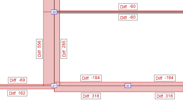 Sie können bei Strecken und Anbindungen über einen Balken die Differenz zweier Attribute des jeweiligen Netzobjekts anzeigen. Bei Matrixspinnen können Sie entsprechend die Differenz zweier Attribute der Beziehung anzeigen. Über Knotenströme zeigen Sie die Differenz zweier Abbiegerattribute an.