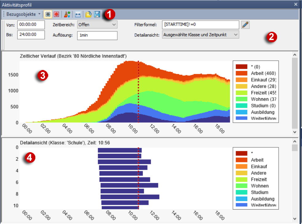 Die zugehörigen Aktivitäten der im zeitlichen Verlauf ausgewählten Klasse (oder Klasse und Zeitpunkt) werden in der Detailansicht angezeigt, daneben eine Legende.