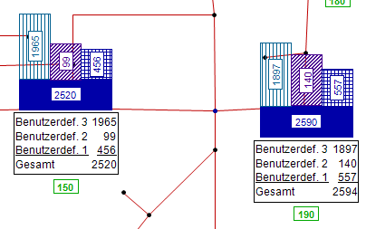 Das Beispiel zeigt Netzobjekte, die sowohl mit Säulendiagrammen als auch mit Tabellen beschriftet sind.