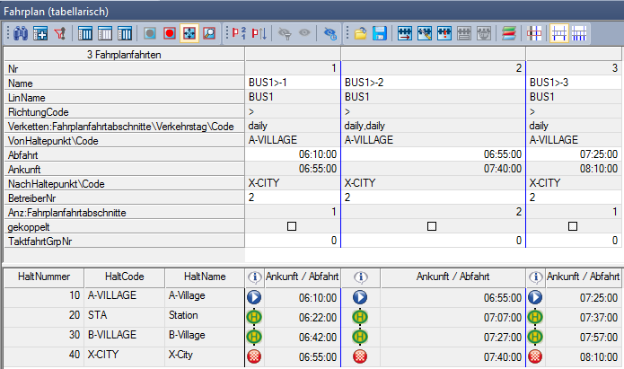 In der Ansicht Fahrplanfahrten entspricht jede Spalte in den Bereichen (2) und (3) einer Fahrplanfahrt. Im Beispiel werden drei Fahrplanfahrten angezeigt. Im Bereich (2) sehen Sie die Attribute der Fahrplanfahrt, im Bereich (3) die Haltefolge und die Ankunfts-/Abfahrtszeiten an den Halten der Fahrplanfahrt.