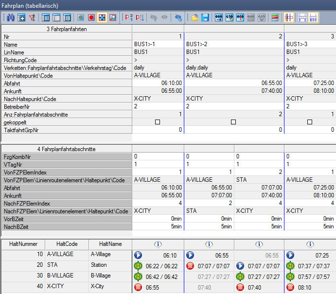 Werden Fahrplanfahrtabschnitte angezeigt, sehen Sie sowohl die Fahrplanfahrten und ihre Attribute als auch die Fahrplanfahrtabschnitte je Fahrplanfahrt. Im Beispiel hat die Fahrplanfahrt Nummer 2 zwei Fahrplanfahrtabschnitte, der erste hat den Start-Haltepunkt 10 A-VILLAGE und den Endhaltepunkt 20 STA, der zweite den Start-Haltepunkt 20 STA und den End-Haltepunkt 40 X-CITY.