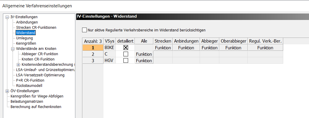3. Wählen Sie in der Spalte detailliert die Option, wenn Sie für ein umzulegendes Verkehrssystem des Netzes die Widerstandsfunktion je Netzobjekttyp definieren wollen.