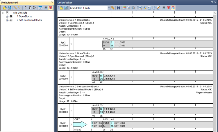 Sie können die Umläufe grafisch als Blockdarstellung anzeigen. Hier können Sie die Umläufe auch bearbeiten (Umlaufversionen und Umläufe bearbeiten).