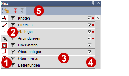 Über dieses Symbol blenden Sie den jeweiligen Objekttyp im Netz ein und aus (Anzeige und Reihenfolge der Grafiklayer ändern).