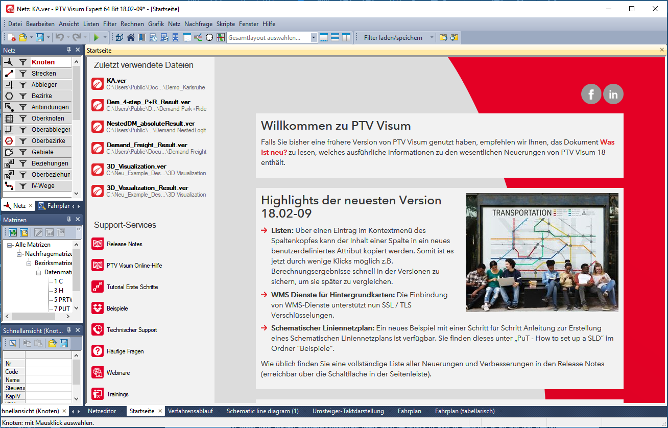 Nach dem Programmstart öffnet sich der Startbildschirm und anschließend die Benutzeroberfläche von Visum mit dem Fenster Startseite.