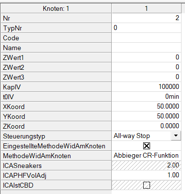 Der Knotentyp (0...99) dient zur Kategorisierung des Knotens für die Definition von Abbiegerstandards (Abbieger verwalten). Hinweis Der Standardtyp ist 0. |