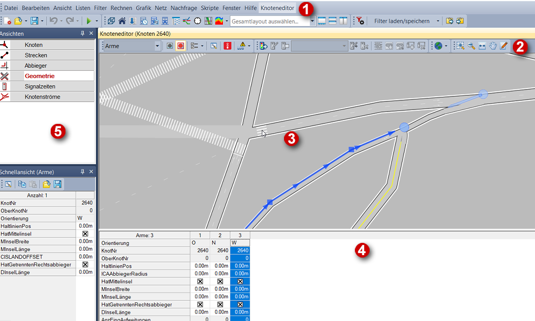 Wenn Sie im Netz im Modus Bearbeiten für Knoten, Oberknoten, Abbieger oder Oberabbieger auf eines dieser Netzobjekte doppelklicken, öffnet sich der Knoteneditor. Hier können Sie das betreffende Netzobjekt weiter modellieren (Grundlagen: Knotenmodellierung).