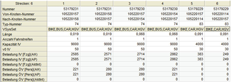 In der Tabellenansicht beschreibt jede Spalte eine Strecke und jede Zeile ein Attribut dieses Objekts.
