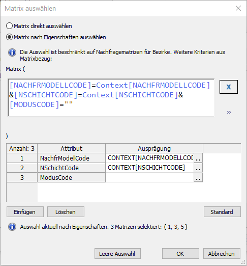 Hinweis: Beim Aufruf des Fensters aus Verfahren der Nachfrageberechnung wird der inhaltliche Zusammenhang berücksichtigt. Es werden die passenden Matrizen für weitere Einschränkungen angeboten. Diese nicht bearbeitbare Bedingung wird über dem freien Textfeld angezeigt und mit einem logischen Und (&) mit allen von Ihnen getroffenen Einschränkungen verknüpft. Rufen Sie das Fenster beispielsweise aus den Verfahrensparametern heraus auf, sind passende Bedingungen schon voreingestellt. Sie können diese Einstellung verändern, aber auch wieder auf den ursprünglichen Zustand zurück setzen indem Sie auf die Schaltfläche Standard klicken. Zahlreiche Beispiele für das Auswählen von Matrizen nach Eigenschaften finden Sie hier (Matrizen und Attributsvektoren während des Verfahrensablaufs kombinieren). |