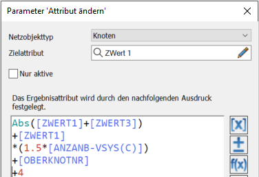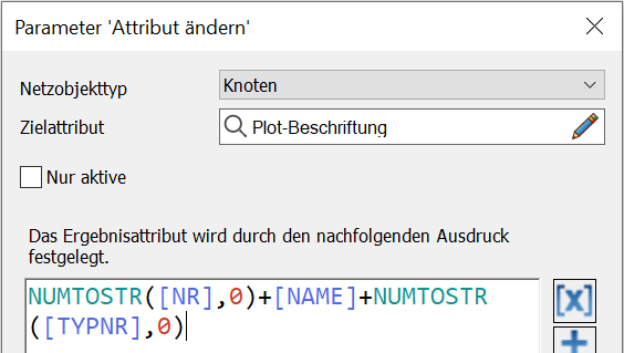 Mit der Einstellung ergibt sich der Wert des alphanumerischen, benutzerdefinierten Zielattributs Plot-Beschriftung (Typ Text) aller Knoten im Netz aus den Knoten-Attributen Nummer, Name und TypNr.