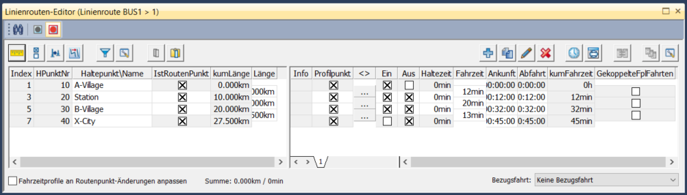 In dem Fenster können Sie links die Linienrouten-Verläufe und rechts die zugeordneten Fahrzeitprofile bearbeiten. Die Bereiche korrespondieren miteinander.