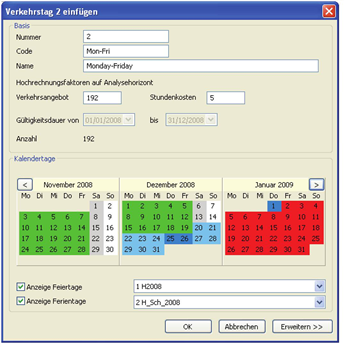 Die gemäß den eingestellten Optionen ausgewählten Tage werden über die Schaltfläche im Kalender als Tage angezeigt, die zur Auswahl der relevanten Kalendertage hinzugefügt werden sollen. Die Tage werden hellgrün hinterlegt. Hinweis Die Anzeige ist nur eine Vorschau. Die angezeigten Tage werden dem Verkehrstag erst nach einem Mausklick auf die Schaltfläche Auswahl übernehmen als relevante Kalendertage zugeordnet. |