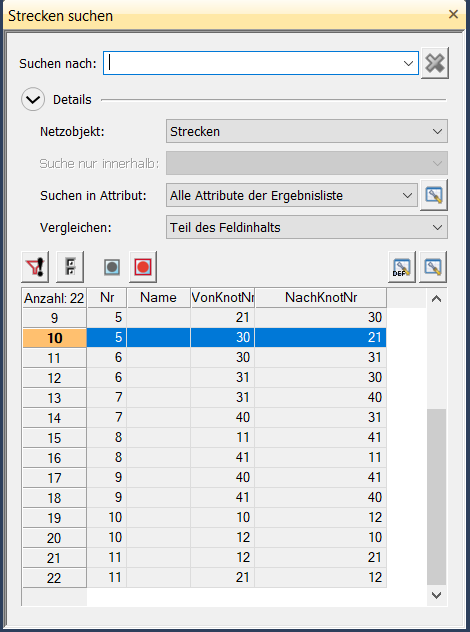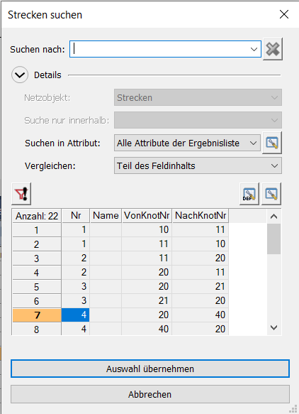 Hinweis: Wenn Sie die Suche nach Netzobjekten in einem anderen Fenster als dem Netzeditor aufrufen, ist die Funktionalität eingeschränkt. Folgende Aktionen sind dann nicht möglich: