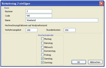 Nummer Eindeutige Nummer des Verkehrstags Code Kurzbezeichnung des Verkehrstags Name Langbezeichnung des Verkehrstags Verkehrsangebot Hochrechnungsfaktor für Kenngrößen des Verkehrsangebots vom Umlegungszeitraum auf einen längeren Zeitraum, beispielsweise 1 Jahr Stundenkosten Hochrechnungsfaktor für Stundenkosten vom Umlegungszeitraum auf einen längeren Zeitraum, beispielsweise 1 Jahr |