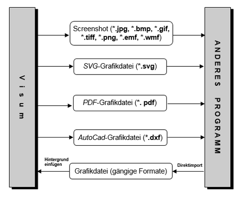 Die folgende Abbildung zeigt den möglichen Datenaustausch zwischen Visum und externen Grafikprogrammen.