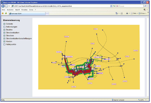 Der Bildschirmausschnitt ist als eine in HTML eingebettete Datei *.svg gespeichert. Die Ebenen für die Objekte Anbindungen und Haltepunkte sind ausgeschaltet und daher nicht sichtbar.