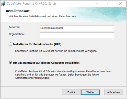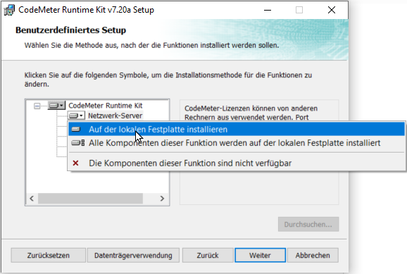 1.  Installieren Sie die Datei Setup_LicenseManagerServer <Versionsnummer>x64.exe und stellen Sie dabei sicher, dass auch das CodeMeter Runtime Kit installiert wird.