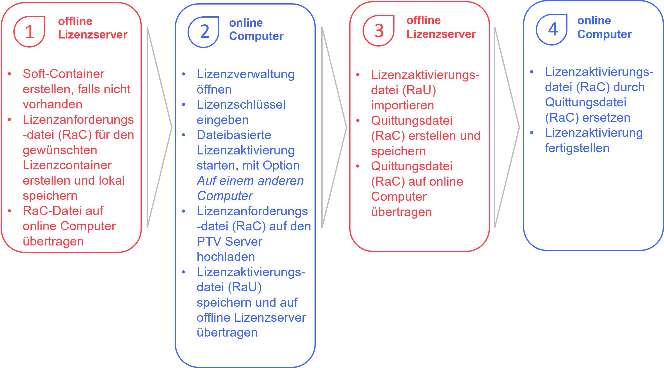 In der folgenden Grafik sehen Sie zusammengefasst den Ablauf der dateibasierten Lizenzaktivierung unterschieden nach Lizenzserver ohne Internet (rot) und Computer mit Internetverbindung (blau).