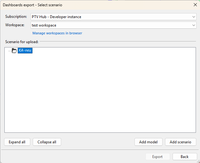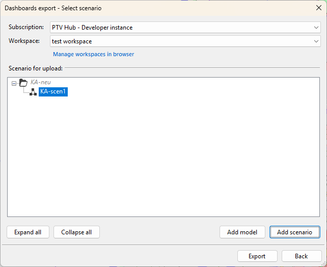 The Dashboards export - Select network objects window opens. A list of all available models with the corresponding scenarios is displayed.